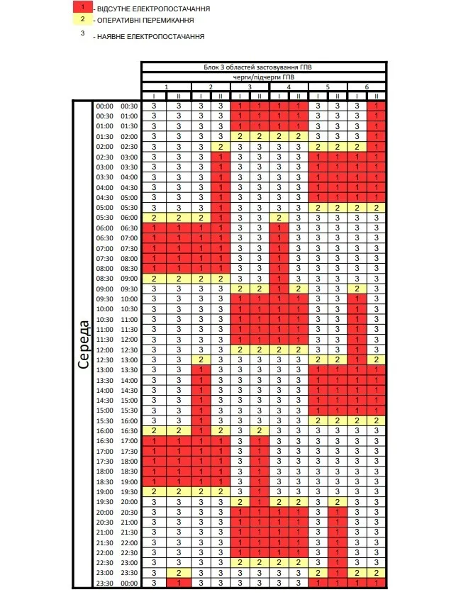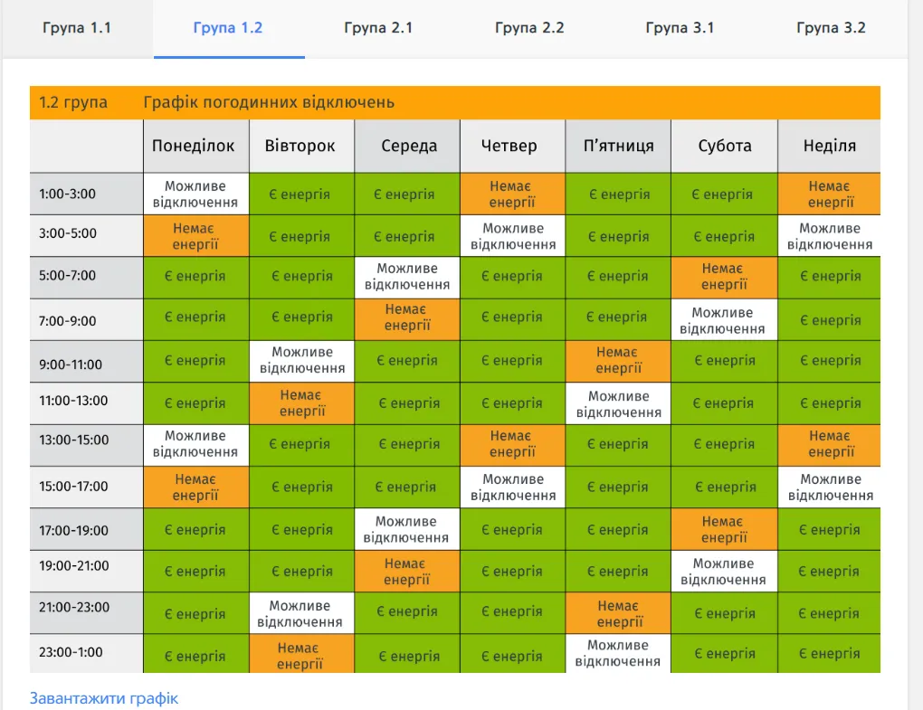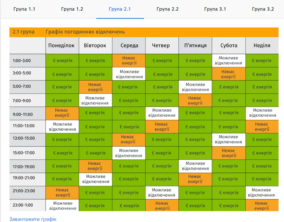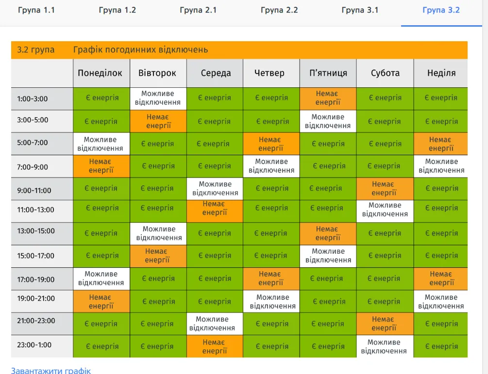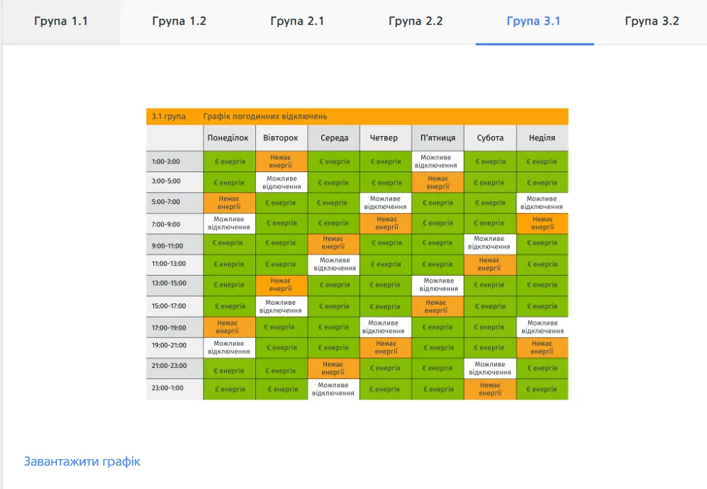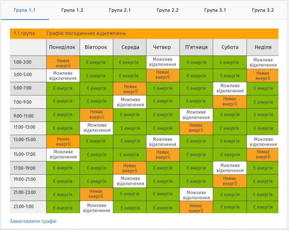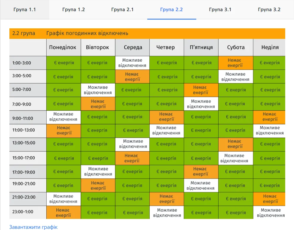 Червоним кольором виділено годинник без світла для вашої групи, жовтим – годинник, в який електроенергія може зникнути через оперативні перемикання. Зеленим кольором позначений період, коли світло буде при стабільній ситуації в енергосистемі. Свою групу відключень можна переглянути тут.