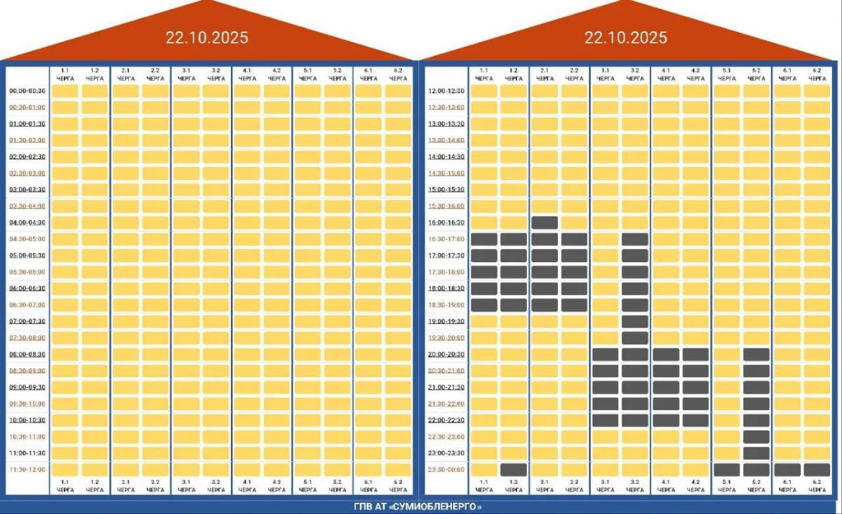 У Сумах та області графік розділено на черги. Ось тут є повний список адрес, знайдіть свою адресу і подивіться, до якої групи належите. Ось графік для всіх груп: