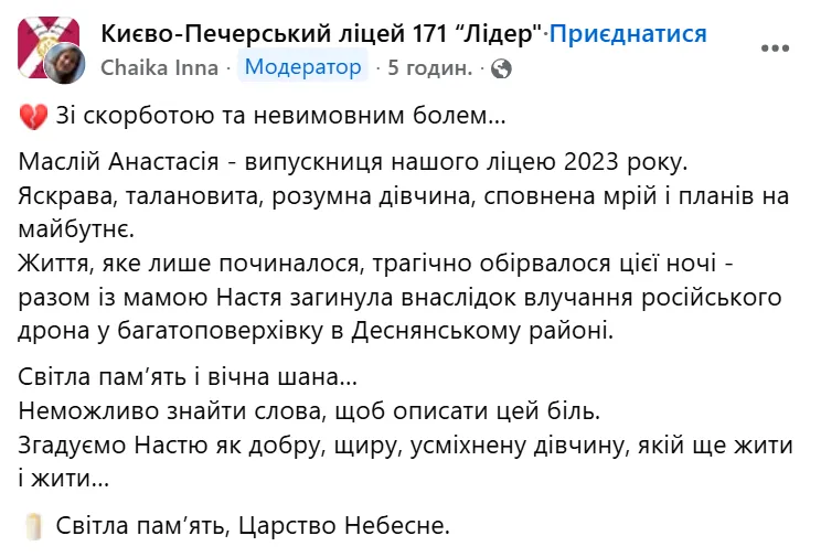 «Зі скорботою та невимовним болем… Маслій Анастасія — випускниця нашого ліцею 2023 року. Яскрава, талановита, розумна дівчина, сповнена мрій і планів на майбутнє. Життя, яке лише починалося, трагічно обірвалося цієї ночі — разом із мамою Настя загинула внаслідок влучання російського дрона у багатоповерхівку в Деснянському районі. Світла пам’ять і вічна шана… Неможливо знайти слова, щоб описати цей біль. Згадуємо Настю як добру, щиру, усміхнену дівчину, якій ще жити і жити… Світла пам’ять, Царство Небесне», – написала класна керівниця Інна Чайка.