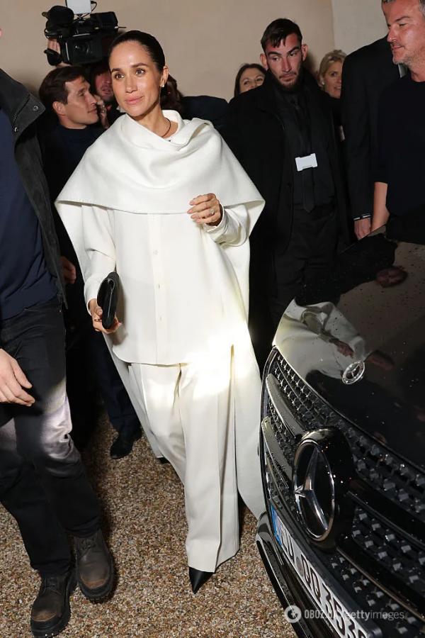 Для модного заходу Меган обрала бездоганний білий total look: накидку оверсайз, сорочку на ґудзиках і широкі штани, поєднавши їх із чорними туфлями на підборах з гострим мисом. Мінімалістичні золоті аксесуари, гладкий зачесаний пучок і легкий макіяж підкреслили її стриману елегантність.