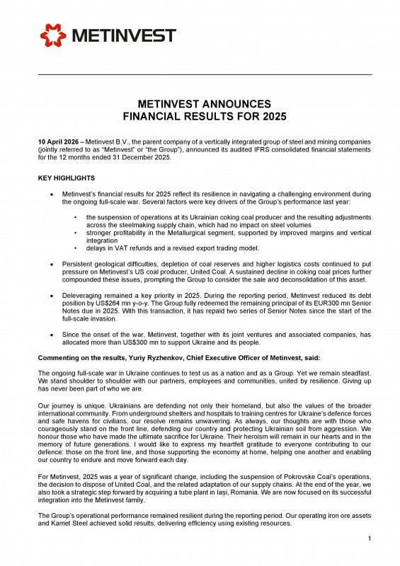 «Метінвест» скоротив збитки: оприлюднено фінзвіт за 2025 рік