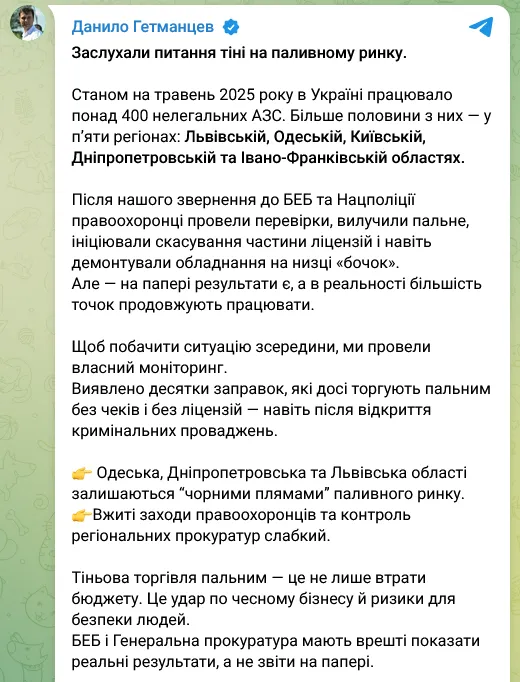 При цьому нардеп наголосив: тіньова торгівля пальним призводить до втрат бюджету, б’є по чесному бізнесу і створює ризики для безпеки людей. А тому «БЕБ і Генеральна прокуратура мають нарешті показати реальні результати, а не звіти на папері».