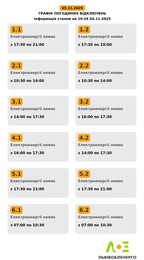 У середу у Львівській області почнуть вимикати електроенергію о 10.30 і закінчать погодинні вимкнення о 21.00.
