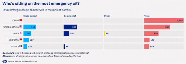Вважається, що Китай має найбільші резерви на випадок надзвичайних ситуацій — щонайменше на 50% більше, ніж у США. Хоча Пекін ретельно приховує точні цифри, аналітична компанія Vortexa, що спеціалізується на енергетиці та судноплавстві, оцінила загальні запаси країни в 1,3 мільярда барелів.