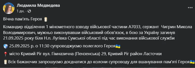 «Командир відділення 1 мінометного взводу військової частини А7033, сержант Чигрин Микола Володимирович, мужньо виконувавши військовий обовʼязок, у бою за Україну загинув 21.09.2025 року», – йдеться в повідомленні.