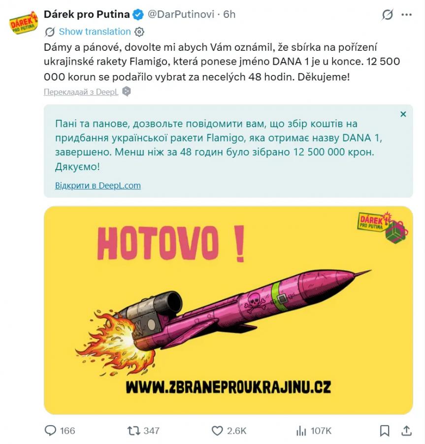 Чеська ініціатива «Подарунок Путіну» всього за один день зібрала необхідну суму для виготовлення української крилатої ракети з плоскою траєкторією польоту Flamingo. На рахунок кампанії надійшло понад 12,5 млн чеських крон, тобто близько $600 тис. Внески зробили понад 8 тисяч людей.