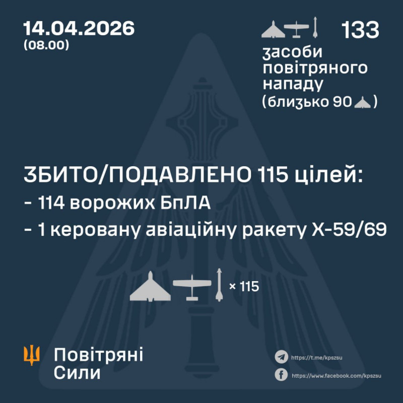 У ніч на 14 квітня російська армія запустила по території України чотири керовані ракети та 129 ударних дронів. ППО знешкодила ракету і 114 безпілотників.