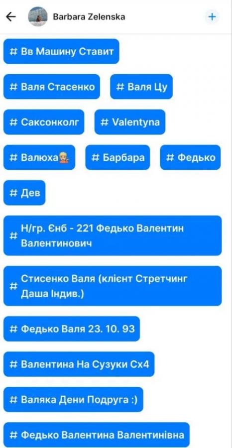 У сервісі GetContact видно, що жінка записувалась на індивідуальні заняття зі стретчингу, також її кілька разів підписали з використанням абревіатури СБУ. Співрозмовники OBOZ.UA в Службі безпеки розповіли, що вся родина дівчини тісно пов’язана з СБУ. У Службі працювали і її тато, і мати. При чому, тато був оформлений як механік, а мати – у військово-медичному управлінні спецслужби. Що цікаво, батьки Валентини до повномасштабної війни розміщували свої декларації в реєстрі НАЗК.