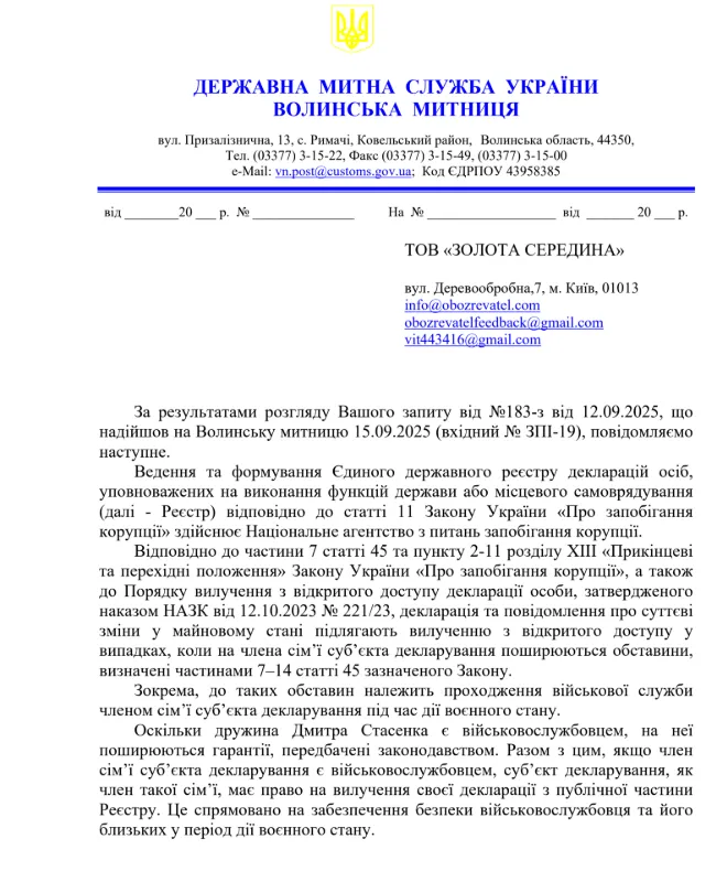 OBOZ.UA відправив запит у Волинську митницю з проханням роз’яснити мету приховування декларацій Стасенка.