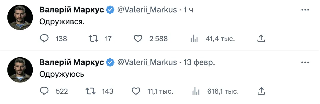 На особистій сторінці в соцмережі Х він оприлюднив лаконічне повідомлення: «Одружуюсь». Ймовірно, цим дописом військовий повідомив, що наважився на важливий крок і, можливо, тоді зробив коханій пропозицію. Через три дні Маркус написав: «Одружився», чим, вочевидь, підтвердив, що більше не холостяк.
