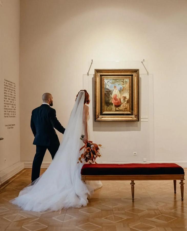 Валерій Маркус оприлюднив рідкісну світлину зі своєю дружиною, яку ретельно приховує від публіки. Подружжя попозувало на камеру спиною до об’єктиву в красивих весільних образах, дивлячись на картину Тараса Шевченка «Катерина».