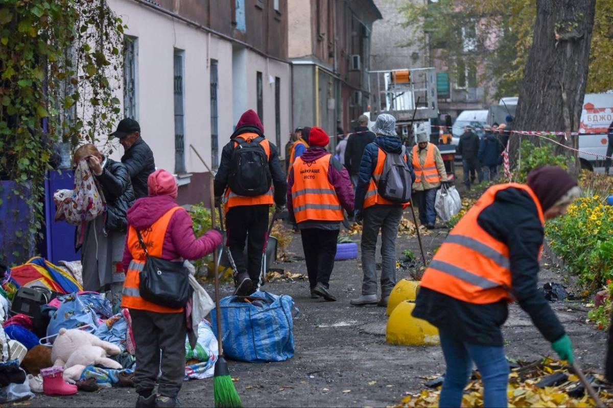 На місці працюють комунальники, які прибирають сміття та уламки зруйнованого даху будинку по вул. Васильєвській. Також тут працюють рятувальники, представники благодійної організації, розгорнуто пункти прийому заявок від постраждалих мешканців.