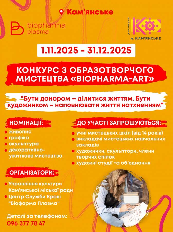 ТОВ ЦСК «Біофарма плазма» та департамент культури Камянського оголошують конкурс з образотворчого мистецтва «Biopharma-ART». 1. Загальні положення 1.1. Конкурс з образотворчого мистецтва «Biopharma-ART» (далі – Конкурс) проводиться з метою популяризації ідеї донорства через мистецтво, формування гуманістичних цінностей, розвитку творчості серед молоді та професійних митців. 1.2. Головне гасло Конкурсу: «Бути донором – ділитися життям. Бути художником – наповнювати життя натхненням». 1.3. Організатором Конкурсу є управління культури міської ради, ТОВ ЦСК «Біофарма плазма». 1.4. Конкурс проводиться на территорії Кам’янської міської територіальної громади. 2. Мета та завдання Конкурсу • популяризація донорського руху через мистецькі засоби; • формування позитивного іміджу донора як символу доброти, співчуття й відповідальності; • підтримка талановитих митців та учнів мистецьких шкіл; • розвиток креативного мислення, виховання гуманістичних ідей через мистецтво; • об’єднання художників і творчих спільнот навколо соціально важливої теми. 3. Учасники Конкурсу 3.1. До участі запрошуються: • учні мистецьких шкіл (від 14 років); • викладачі мистецьких навчальних закладів; • художники, скульптори, члени творчих спілок; • художні студії та об’єднання. 3.2. Участь у Конкурсі є безкоштовною. 4. Номінації Конкурсу • Живопис • Графіка • Скульптура • Декоративно-ужиткове мистецтво 5. Умови участі 5.1. Учасники подають одну роботу (за вибором) у будь-якій з номінацій. 5.2. Твори повинні відповідати тематиці Конкурсу: донорство, життя, добро, взаємопідтримка, людяність, натхнення, відновлення та бути 5.3. До кожної роботи подається заявка (додаток до Положення), яка містить: • прізвище, ім’я, по батькові автора; • вік; • навчальний заклад / організацію / статус (учень, викладач, художник тощо); • контактний телефон та e-mail; • назву та короткий опис роботи. 5.4. Роботи подаються у встановлений термін — з 01.11.2025 до 31.12.2025 до Кам`янської художньої школи імені Роберта Лісовського за адресою: вул. Валентина Бурхана, 9, ПН-ПТ з 13.00 до 16.00. 6. Критерії оцінювання • відповідність тематиці; • художня майстерність і композиційна цілісність; • оригінальність задуму; • емоційна виразність; • креативність подачі ідеї донорства. 7. Визначення переможців та нагородження 7.1. Роботи оцінює професійне журі, до складу якого входять представники організаторів, відомі митці, мистецтвознавці. 7.2. За підсумками Конкурсу визначаються переможці у кожній номінації. 7.3. Переможці та лауреати отримують дипломи, цінні подарунки та можливість експонування своїх робіт на підсумковій виставці «Biofarma-ART». За рішенням професійного журі та організаторів може буди визначена грошова винагорода для окремих учасників. 7.4. Найкращі роботи можуть бути використані у соціальних кампаніях, виставках або благодійних заходах, присвячених донорству (з дозволу автора). 8. Підсумкова виставка 8.1. Після завершення Конкурсу організовується підсумкова виставка, де будуть представлені найкращі твори учасників та відбудеться нагородження переможців. 8.2. Виставка може бути проведена у культурних закладах, галереях або онлайн-форматі. 9. Контактна інформація: за телефоном 096 377 78 47 Додаток 1 ЗАЯВКА УЧАСНИКА 1. Прізвище, ім’я, по батькові __________________________________________ 2. Дата народження __________________________________________ 3. Вік ________________________