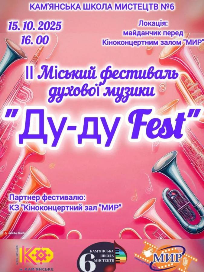 Городян запрошують на ІІ Міський фестиваль духової музики “Ду-ду Fest”. Не пропустіть яскраву подію осені — свято музики, драйву та гарного настрою! На вас чекають виступи духових оркестрів, жива музика та неповторна атмосфера. Дата: 15 жовтня 2025 року Час: 16:00 Місце: майданчик перед Кіноконцертним залом «Мир», м. Кам’янське Контактна особа: Галина Клименко — 093 781 0167 Приходьте всією родиною, беріть друзів і пориньте у світ духової музики.