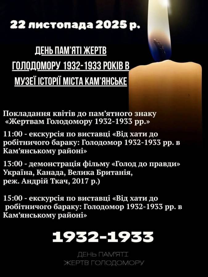 Музей історії міста Кам’янське запрошує долучитися до заходів, присвячених Дню пам’яті жертв Голодомору 1932-1933 років. Цього дня ми вшановуємо мільйони невинних жертв, убитих тоталітарним режимом. Прийдіть, щоб пам’ятати та засвідчити істину. Програма заходів у Музеї історії міста Кам’янське: 11:00 — Екскурсія по виставці «Від хати до робітничого бараку: Голодомор 1932-1933 рр. в Кам’янському районі». 13:00 — Демонстрація фільму «Голод до правди» (Україна, Канада, Велика Британія, реж. Андрій Ткач, 2017 р.). 15:00 — Повторна екскурсія по виставці «Від хати до робітничого бараку: Голодомор 1932-1933 рр. в Кам’янському районі». Протягом дня також відбудеться покладання квітів до пам’ятного знаку «Жертвам Голодомору 1932-1933 рр.». Дата: 22 листопада 2025 р. Місце: Музей історії міста Кам’янське Пам’ятаймо! Пам’ять — це зброя. За повідомленням Музею історії Кам’янського.