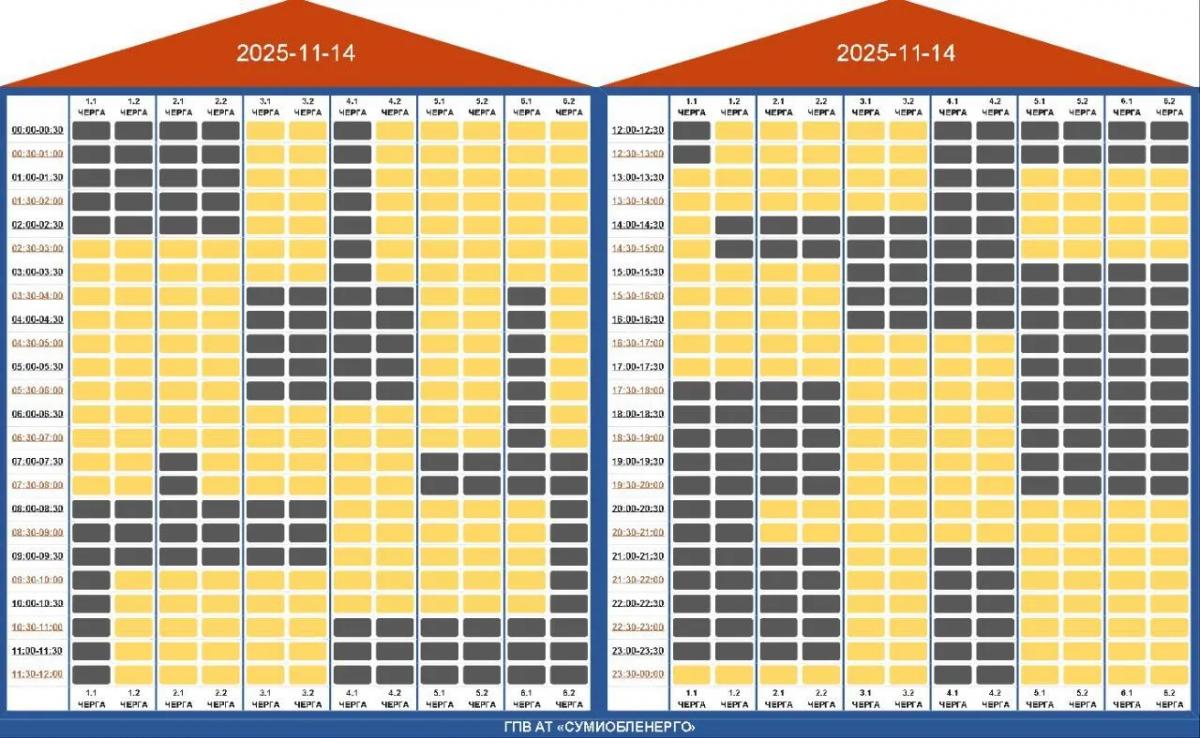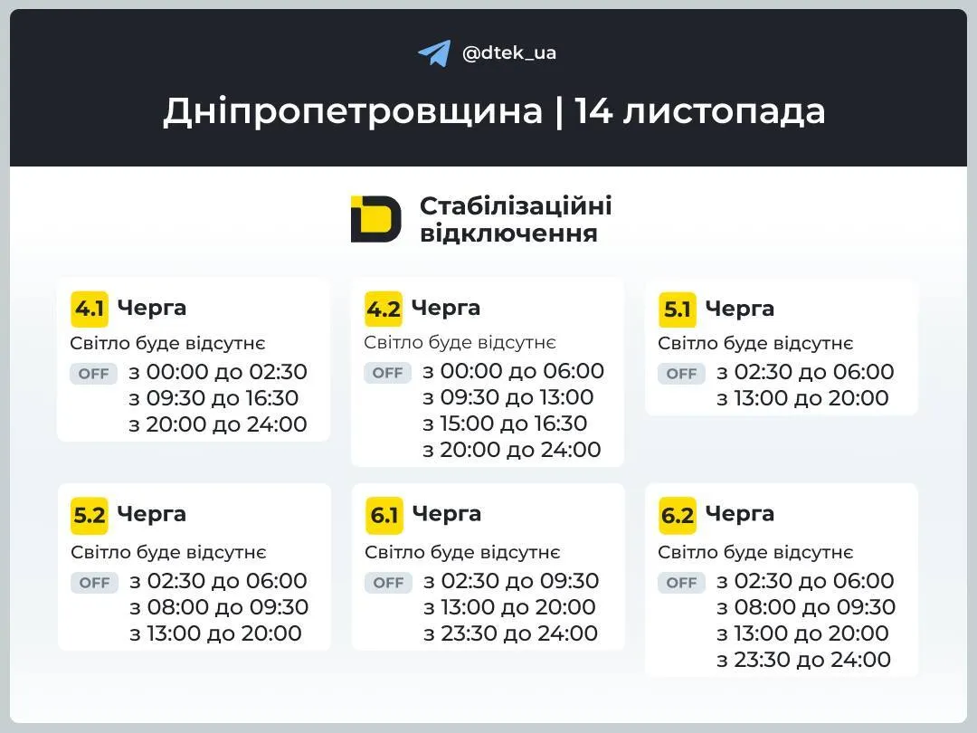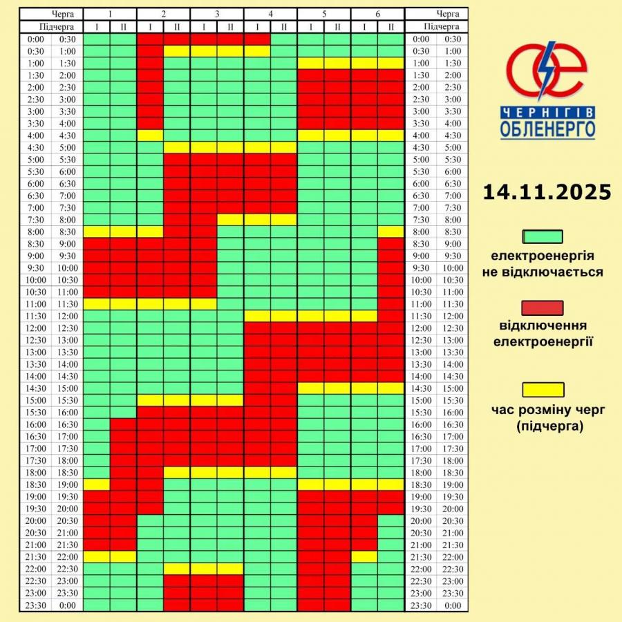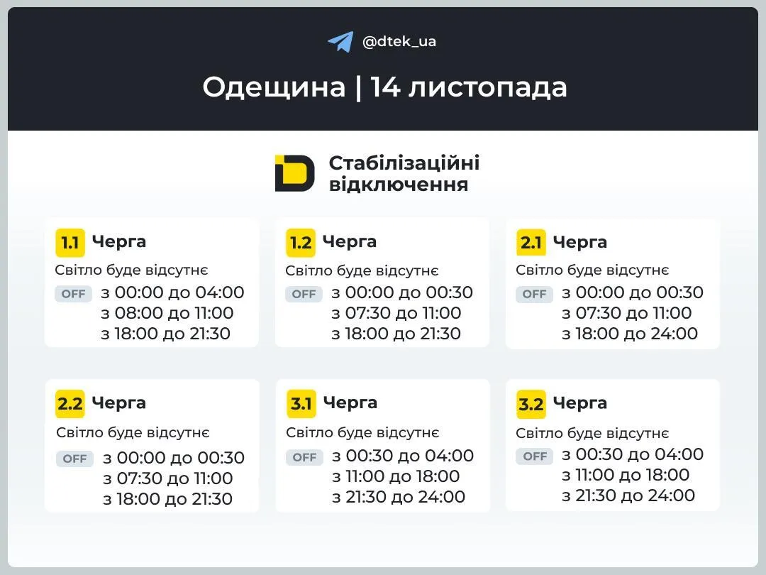 У Полтаві та області 14 листопада з 00:00 до 08:00 запроваджено ГПО в обсязі 2,5 черги, з 08:00 до 15:00 – 3,5 черги, з 15:00 до 20:00 – 4 черги, з 20:00 до 23:59 – 3 черги. За групами графік відключень світла в Полтаві виглядає так: