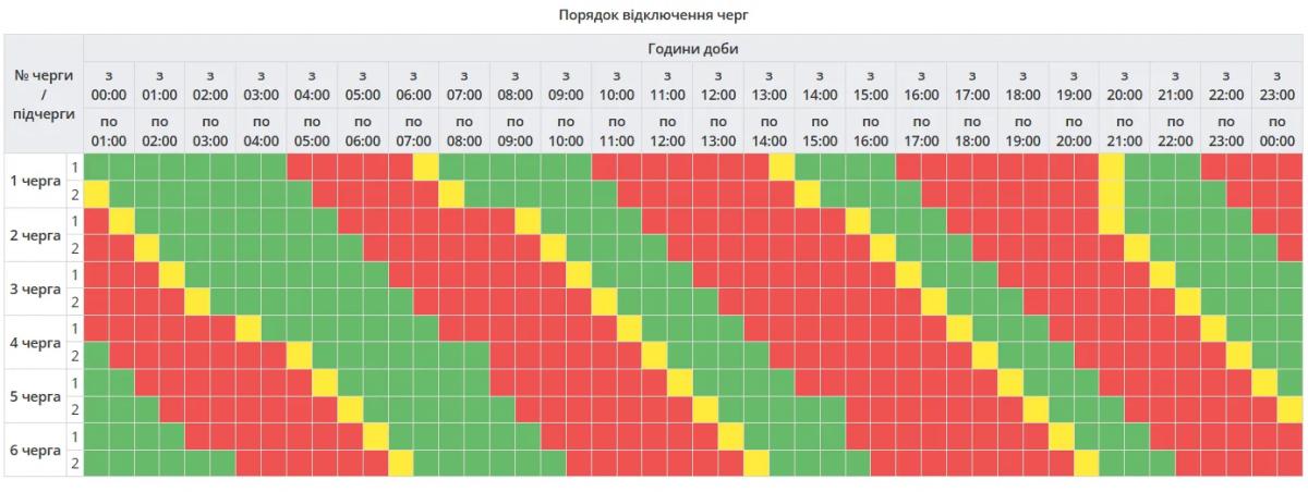 Для споживачів, відповідно до команди «Укренерго», з 00:00 до 08:00 застосовуються 2,5 черги, з 08:00 до 15:00 – 3,5 черги, з 15:00 до 20:00 – 4 черги, з 20:00 до 24:00 – 3 черги. Актуальний графік такий: