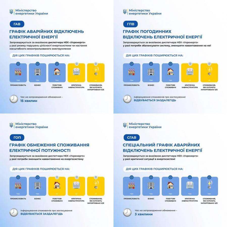 - Для бізнесу та промисловості протягом усієї доби також діють графіки обмеження потужності (ГОП) – вони передбачають не відключення, а зменшення споживання. ГОМ запроваджено в тих самих регіонах, що й погодинні відключення для населення.