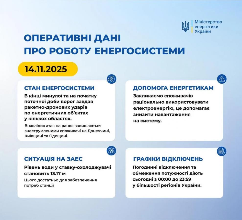 У п’ятницю, 14 листопада, у більшості регіонів масштабно застосовуються погодинні графіки відключень електроенергії. Обмеження діють цілодобово. Спочатку максимальний час без світла на добу в деяких областях сягав 15-16 годин (наприклад, Харківщина, Запоріжжя), проте вдень графіки дещо пом’якшилися і максимум тепер становить 13,5-15 годин. Також оновився розклад для Одеської області.