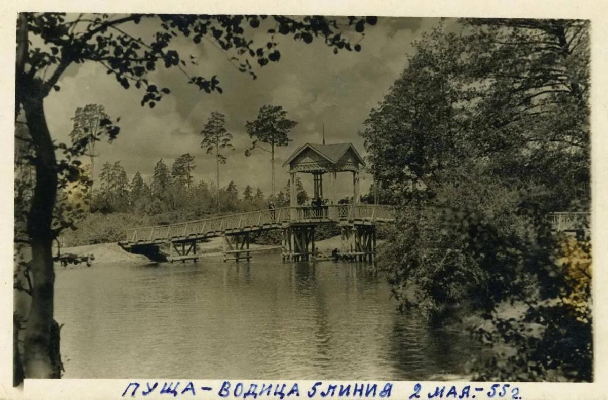 Пуща-Водиця – одна з найвідоміших локацій для відпочинку у Києві. Однією з примітних локацій цієї місцевості є дерев’яний місток, який майже не змінився з 1955 року, коли його зафіксувала камера фотоаматора.