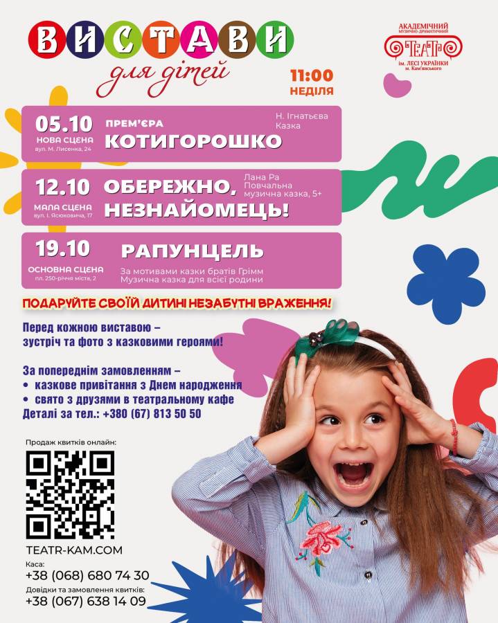 У жовтні в кам’янському Театрі ім. Лесі Українки на дітей та їхніх батьків чекає справжня казкова подорож. На сцені оживуть улюблені історії: – «Котигорошко» – відважний богатир і його незламна дружба; – «Обережно, незнайомець» – повчальна музична казка про важливі правила безпеки; – «Рапунцель» – чарівна історія про силу добра і мрій. А відтепер – ще більше магії після вистави! Після кожної казки маленькі глядачі зможуть познайомитись та сфотографуватись із героями. За попередньою домовленістю можна замовити особливе привітання на день народження від улюблених персонажів. А святковий день із друзями можна провести у затишному театральному кафе. Казковий жовтень у театрі – подаруйте дітям незабутні враження! Телефонуйте для замовлень за номером +38 (067) 813 50 50 Каса: (068) 680 74 30