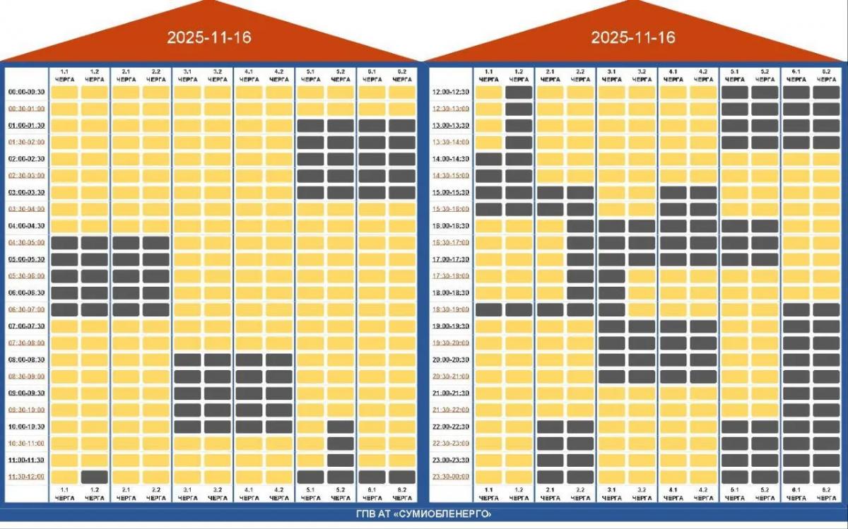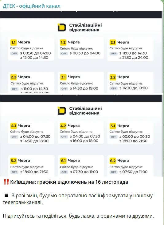 У зв’язку зі складною ситуацією в енергосистемі України, в Полтавській області 16 листопада діятимуть такі графіки: