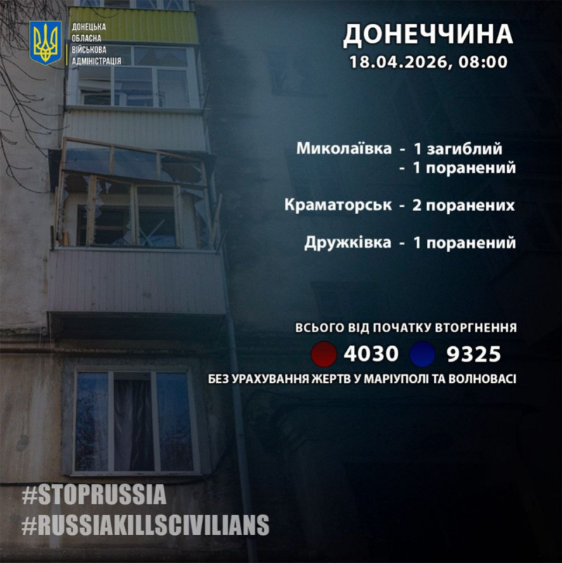 «За 17 квітня росіяни вбили 1 жителя Донеччини: у Миколаївці. Ще 4 людини в області за добу дістали поранення», – ідеться у повідомленні.