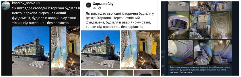Одразу декілька популярних міських пабліків у Telegram та Facebook днями опублікували однакові пости з видами приміщення будинку №1 по вулиці Полтавський шлях. Усі їх супроводжував однаковий, слово в слово, припис: «Через неякісний фундамент будівля в аварійному стані. Тільки під знесення, без варіантів».