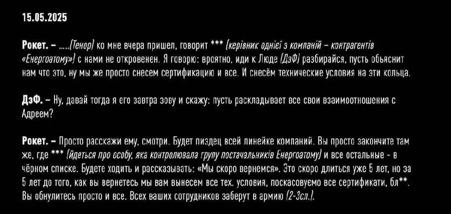 - «Рокет»: Просто скажи йому, дивися. Буде п***ець всій лінійці компаній. Ви просто закінчите там же, де *** (йдеться про особу, яка контролювала групу постачальників «Енергоатому») та всі інші – у чорному списку. Будете ходити й розповідати: «Ми скоро повернемося». Це скоро триває вже 5 років, але за 5 років до того, як ви повернетеся, ми вам винесемо всі техумови, поскасовуємо всі сертифікати, бл***. Ви обнулитеся просто і все.